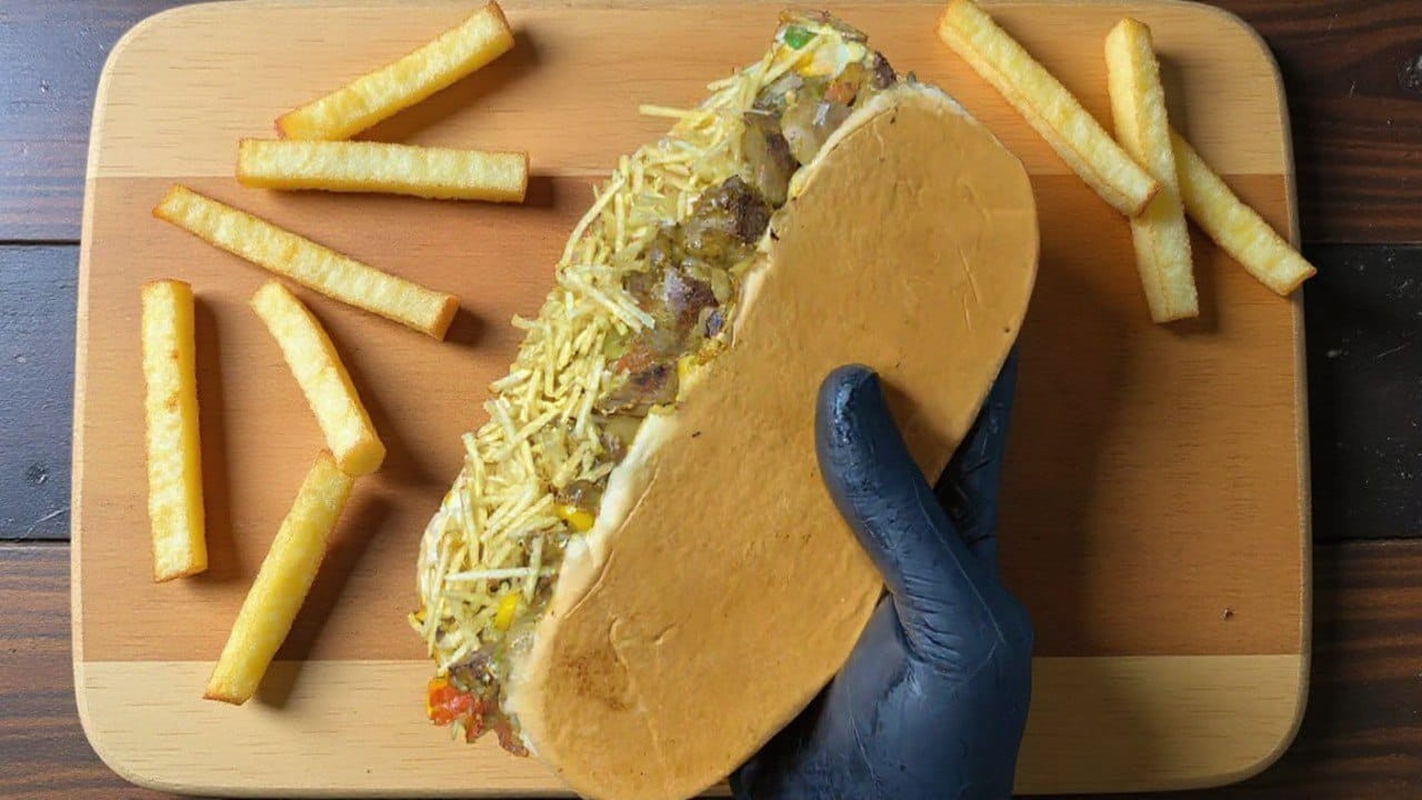 ESCOLHA UM ACOMPANHAMENTO, PÃO PRESUNTINHO 2 SALSICHAS, BACON, MILHO, ERVILHA, VINAGRETE, BATATA PALHA, KATCHUP, MAIONESE