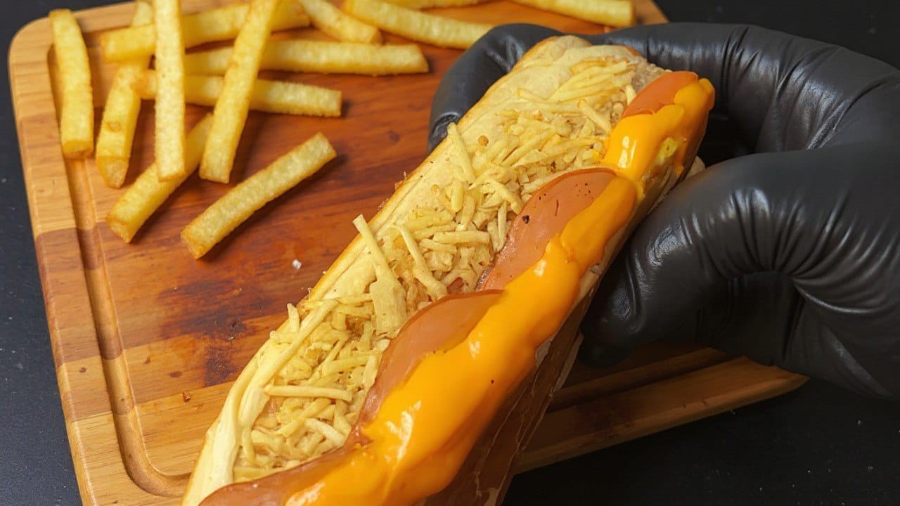 ESCOLHA UM ACOMPANHAMENTO, OVO NA CHAPA, PEITO DE PERU DEFUMADO, MILHO, ERVILHA, VINAGRETE, BATATA PALHA, KATCHUP, MAIONESE TEMPERADA, PAO PRENSADINHO. 2 SALSICHAS